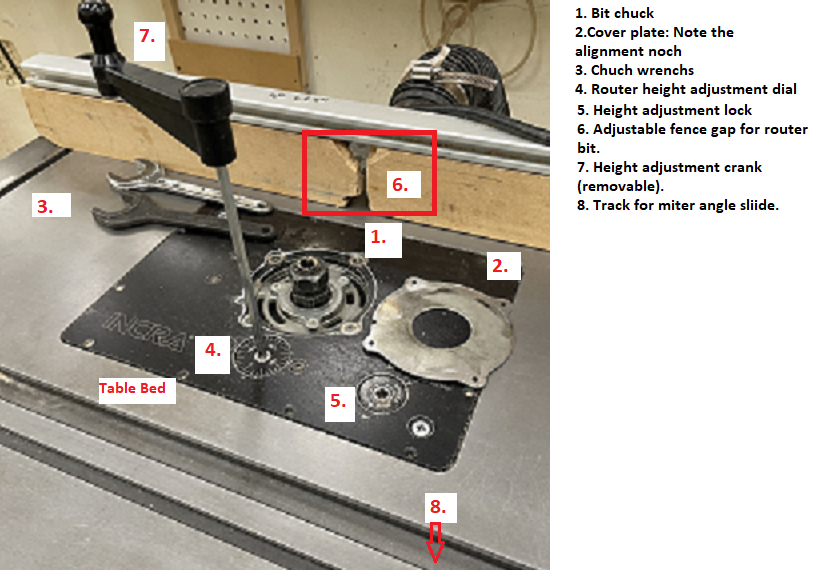 The table router has three basic parts, Table Bed, Adjustable Fence and the actual router (below the Table Bed except for the bit).