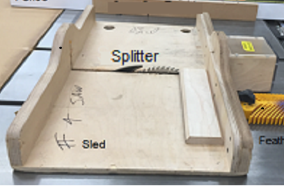 The Vertical Feather Board holds the work tightly to the table. To use on the circular saw it needs a special jig and clamps which can be obtained from the maintenance room. It is more commonly used on the table router, the fence has a track that can hold the feather board with the thumb screws.