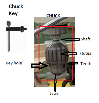 • To thoroughly tighten the jaws the is usually a chuck key which is sort of “t” shaped with teeth that will match the teeth on the top ring of the chuck.