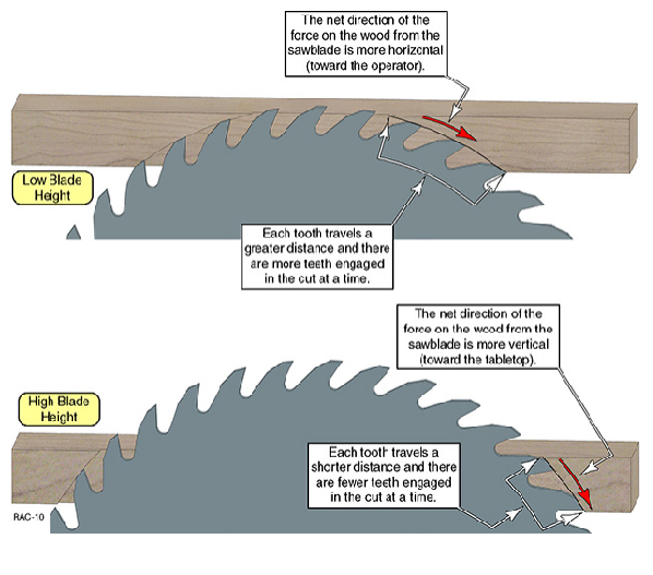 • Recommended height setting: Setting the blade slightly higher than the workpiece is preferred, as it reduces the number of teeth in contact with the wood.