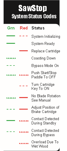 • Contact Detected (Standby or Bypass) The system sensed contact with the blade or arbor. In Bypass Mode, this indicates the brake would have fired in normal operation.