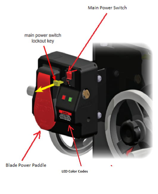 • Do not turn off the Main Power Switch after stopping the blade. It is not necessary to shut off main power after using the paddle switch to stop the motor.