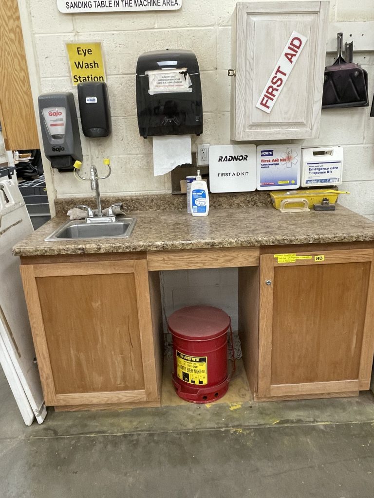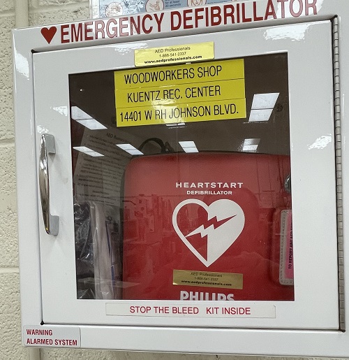 The Wood Workers Club has a First Aid Station to the right of the hallway way leading out of the Machine area. In addition to the normal, non-emergency, items there is an eye wash station and an Emergency Defibrillator which gives recorded instructions for use with minimal training. NOTE: Monitors are not to perform medical procedures, but their first responsibility is to contact the EMTs if appropriate and manage the situation.